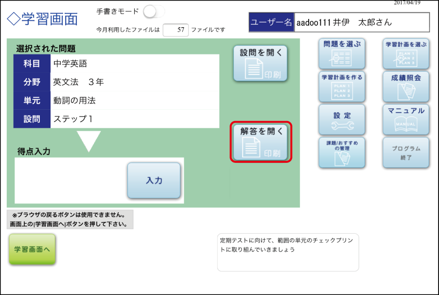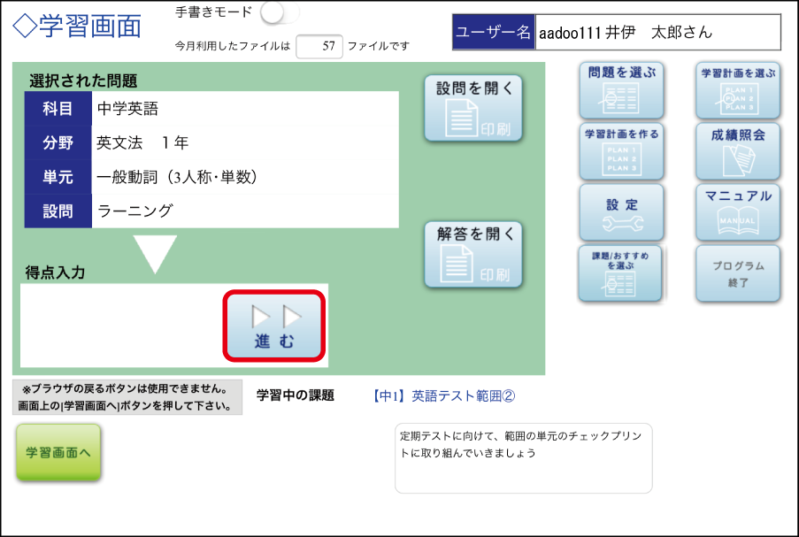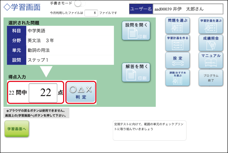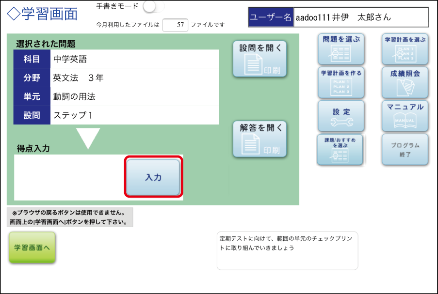 学習画面へもどり、『入力』ボタンをタップして、得点を入力してください。
