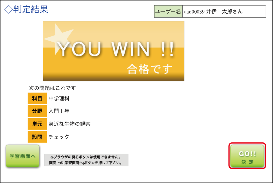 ラーニング(解説)の場合は、『進む』ボタンをタップしてください。